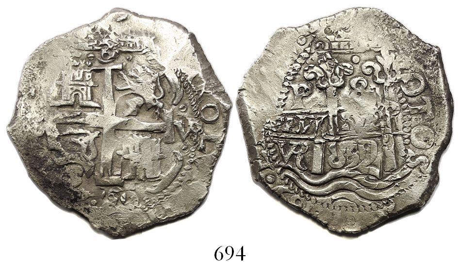 Potosi, Bolivia, cob 8 reales, 1685VR. S-P40; KM-26 ;CT-368. 26.94 grams. Relatively high grade (VF+) but crudely doubled, with full (P)OTOS(I) and (CA)ROLVS II, three dates, two assayers, light toning on fields.