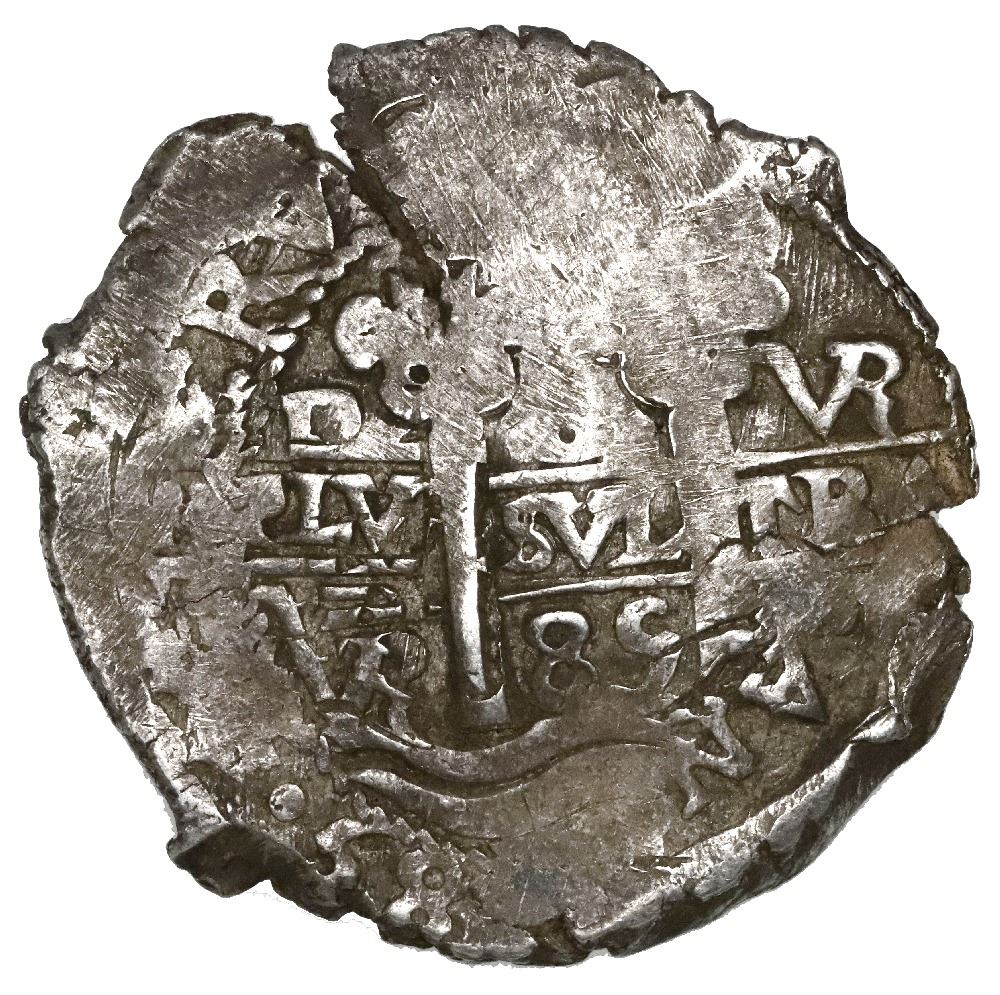 Potosi, Bolivia, cob 8 reales, 1685VR. S-P40; KM-26; Cal-726. 26.24 grams. Round flan with slightly crude edge (as made) with natural crack, full but partially weak pillars and cross, two clear dates and assayers on pillars side, toned AXF for actual wear. Pedigreed to the Arturo Rosenheim collection.