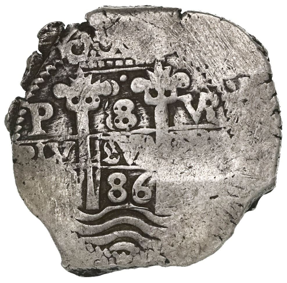 Potosi, Bolivia, cob 8 reales, 1686VR. S-P40; KM-26; Cal-727. 26.83 grams. Bold date, mintmark and assayer on pillars side with bold waves and full pillar-tops, most of cross, but only About Fine overall with much peripheral flatness, toned in crevices. Pedigreed to the Arturo Rosenheim collection.