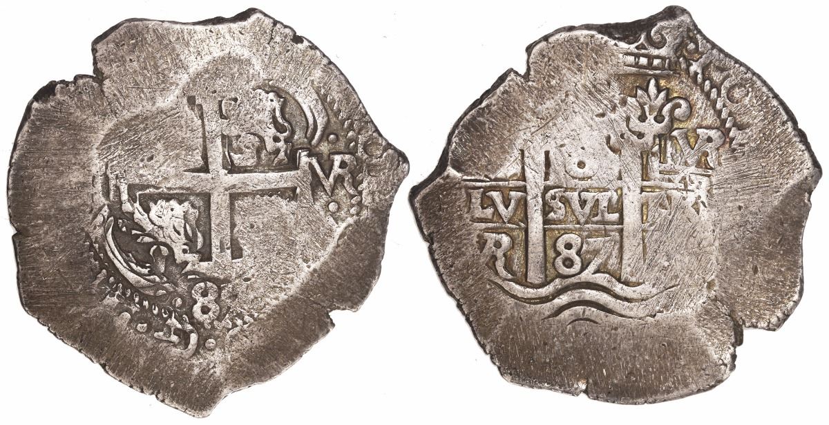 Potosi, Bolivia, cob 8 reales, 1687VR. 27.39 grams. Unusually flat strike on a broad flan, still with most of pillars and cross and two dates and three assayers, AVF for actual wear, lightly toned.