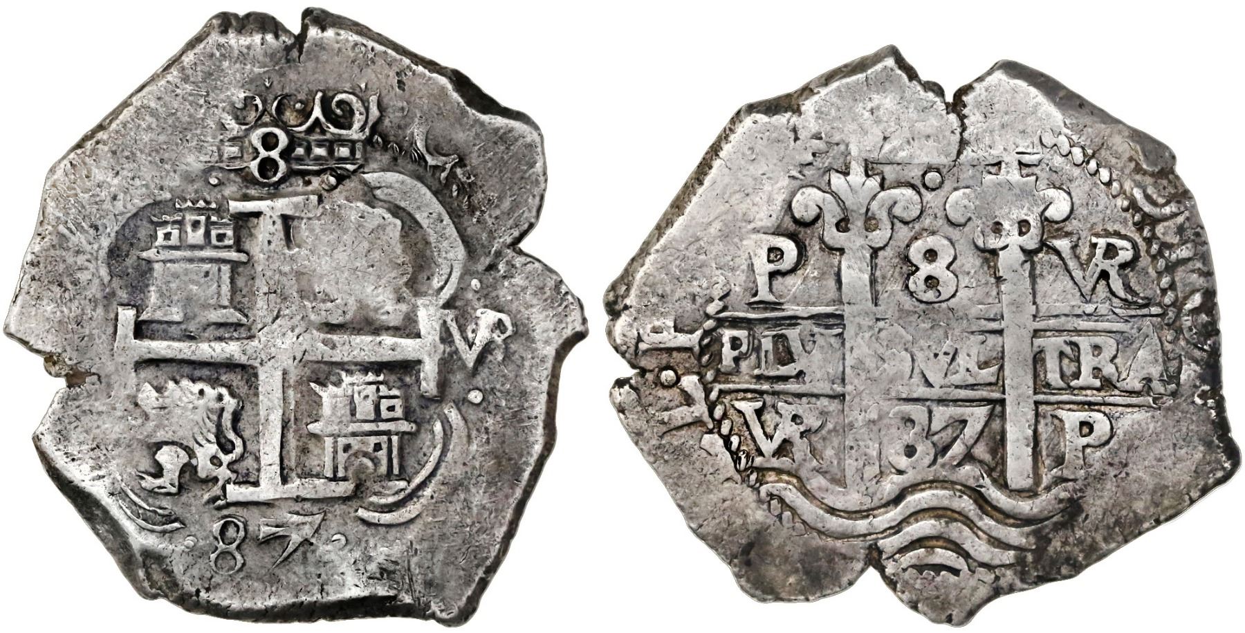 Potosi, Bolivia, cob 8 reales, 1687VR. S-P40; KM-26; CT-372. 27.22 grams. Excellent full pillars-and-waves, also full but partially weak cross with choice castles, two dates, three assayers, lightly toned VF+ with crude edge (as made).
