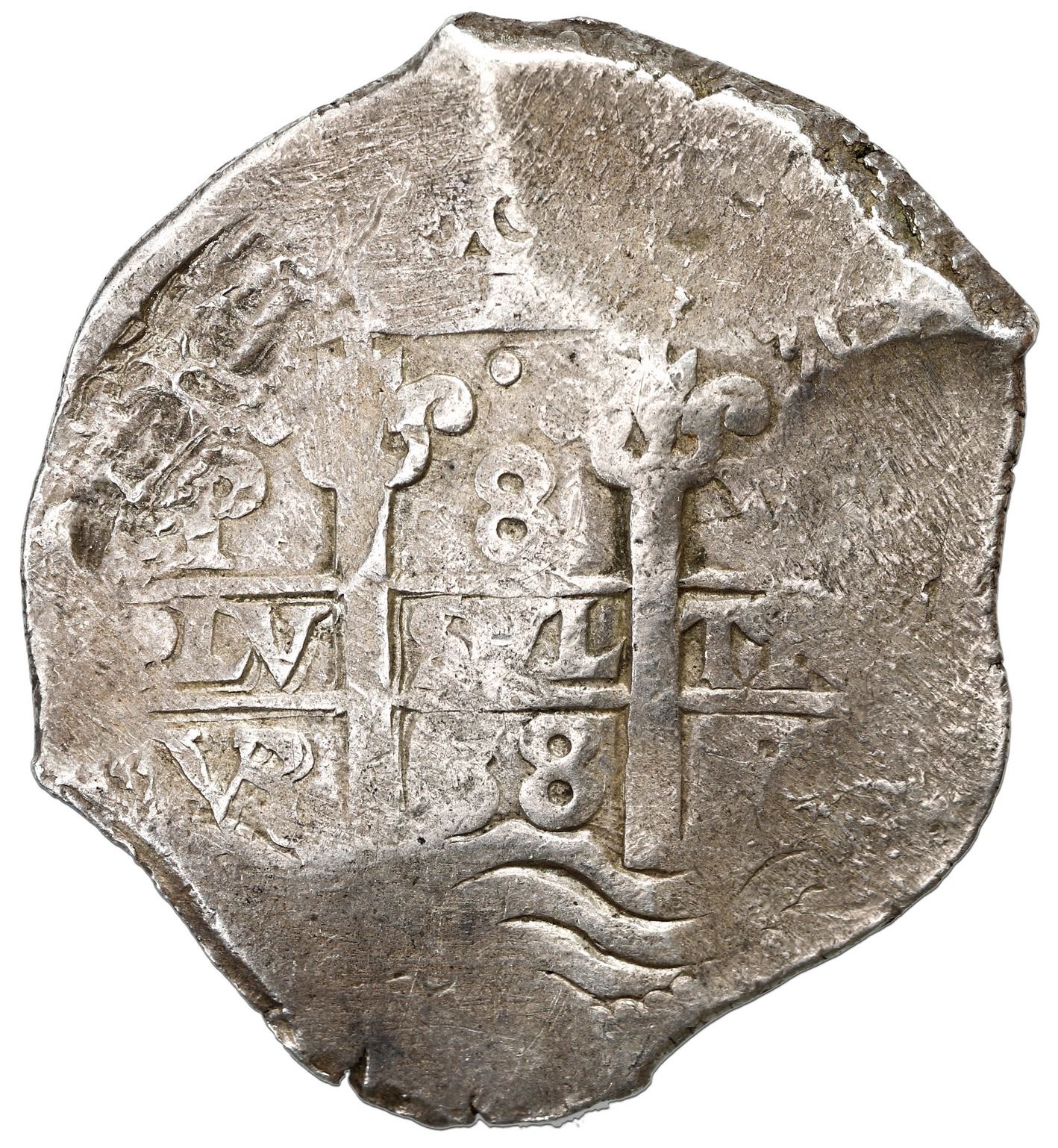 Potosi, Bolivia, cob 8 reales, 1688 VR. S-P40; KM-26; Cal-730. 27.71 grams. Low-contrast Fine+ with much flatness but technically full pillars and cross (nice crown above), faintly toned. Pedigreed to the Ponterio auction of February 1998, with original lot-tag 793.