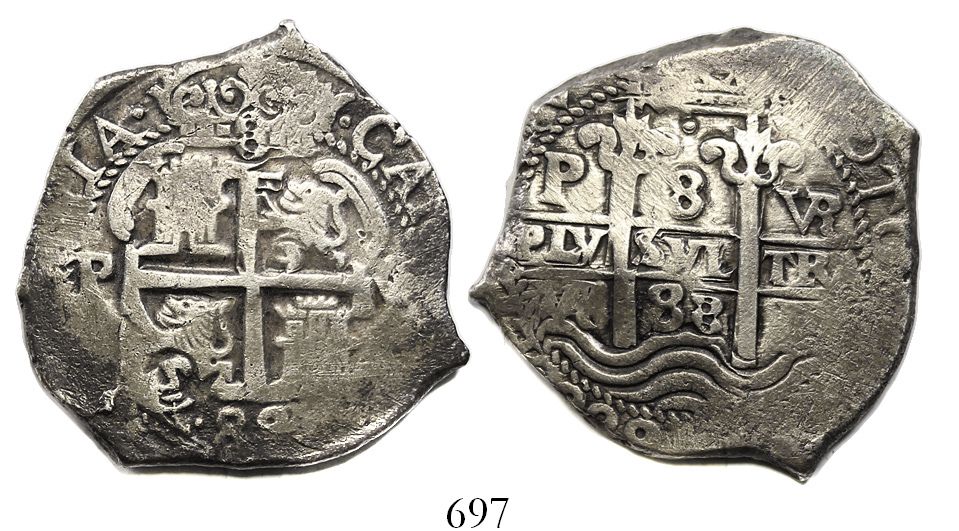 Potosi, Bolivia, cob 8 reales, 1688VR. S-P40; KM-26 ;CT-373. 26.59 grams. Bold full pillars and cross, nice crown with CA(ROLVS) to right, all three dates visible (hence a curious instance of "eight 8's" if you include the two denominations), lightly toned VF. With Historic Real Treasures photo-certificate.