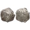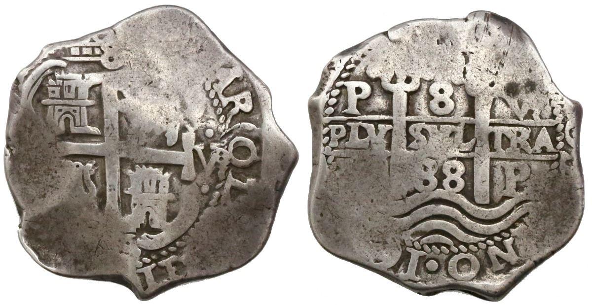Potosi, Bolivia, cob 8 reales, 1688VR. S-P40; KM-26; CT-373. 25.83 grams. Slightly odd-shaped flan with full but partially flat pillars-and-waves and cross, bold ( C)AROL(VS) II, toned Fine.