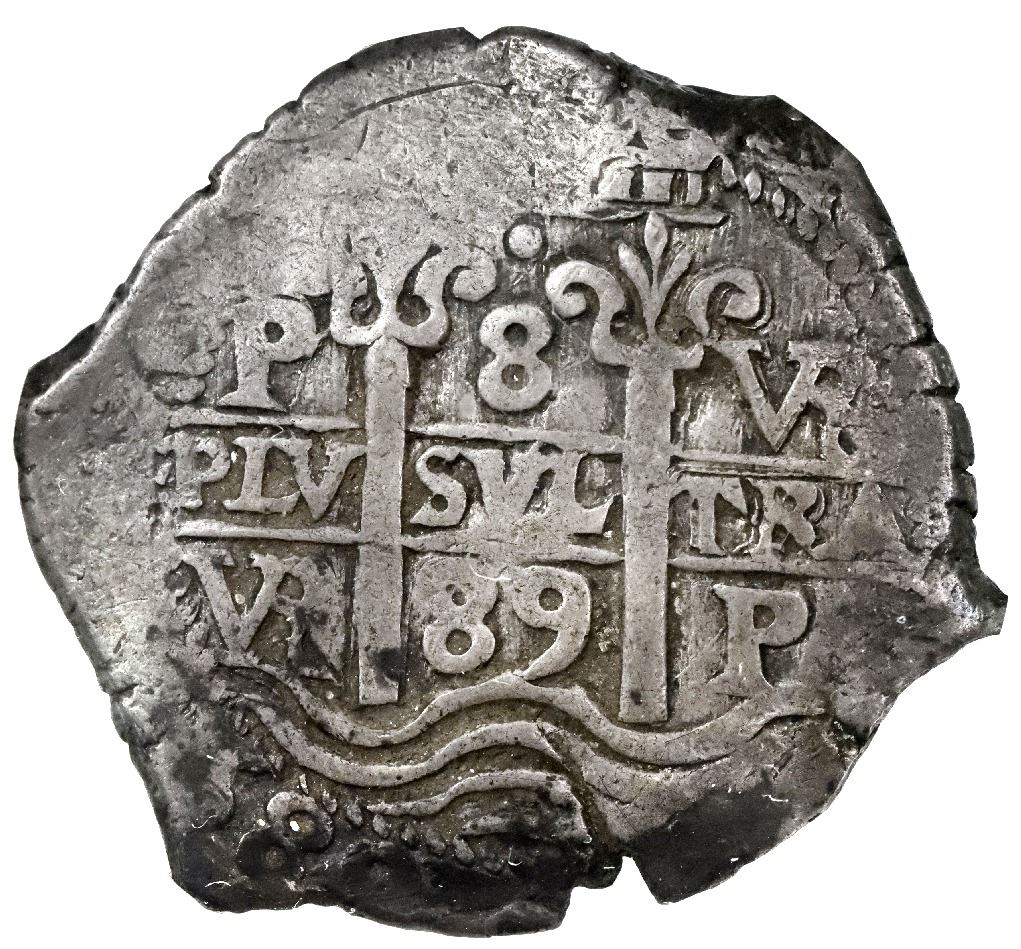 Potosi, Bolivia, cob 8 reales, 1689VR, NGC VF 35. S-P40; KM-26; Cal-731. 26.75 grams. Good full pillars-and-waves with two dates and mintmarks and assayers, off-center cross with full king's name, richly toned (darker near edge). NGC #4435033-009. Pedigreed to the Arturo Rosenheim collection.