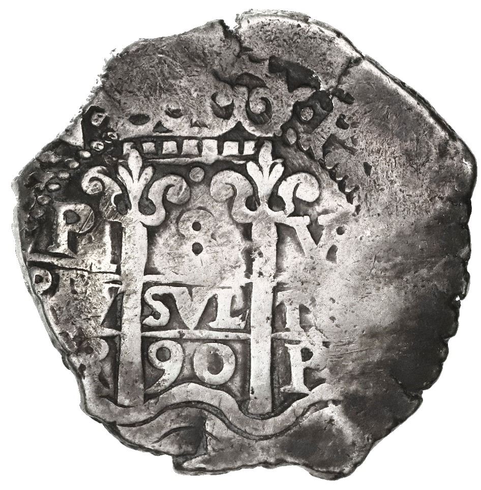 Potosi, Bolivia, cob 8 reales, 1690VR. S-P40; KM-26; Cal-733. 27.16 grams. Full pillars (slightly off-center) with bold date and two assayers despite flatness, the cross even flatter but with part of king's name and ordinal in legend, toned Fine. Pedigreed to the Arturo Rosenheim collection.