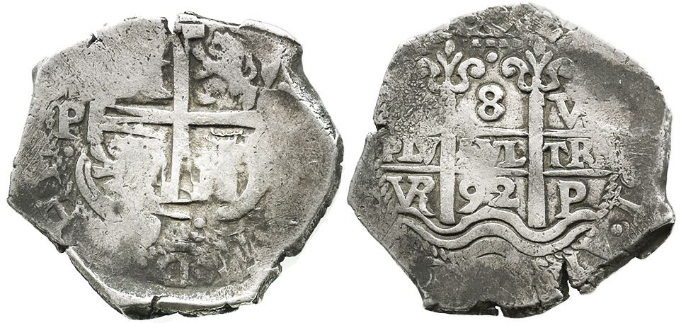 Potosi, Bolivia, cob 8 reales, 1692VR. S-P40; KM-26; CT-378. 26.1 grams. Good full pillars-and-waves, full but partially flat and slightly off-center cross, 2 bold mintmarks, nicely toned AVF.