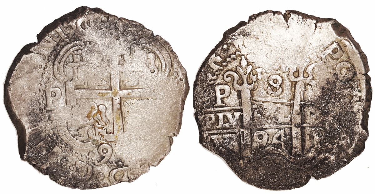 Potosi, Bolivia, cob 8 reales, 1694VR. 26.83 grams. High grade (XF) but with much flatness, full but slightly doubled pillars, two dates, three mintmarks, some dark spots.