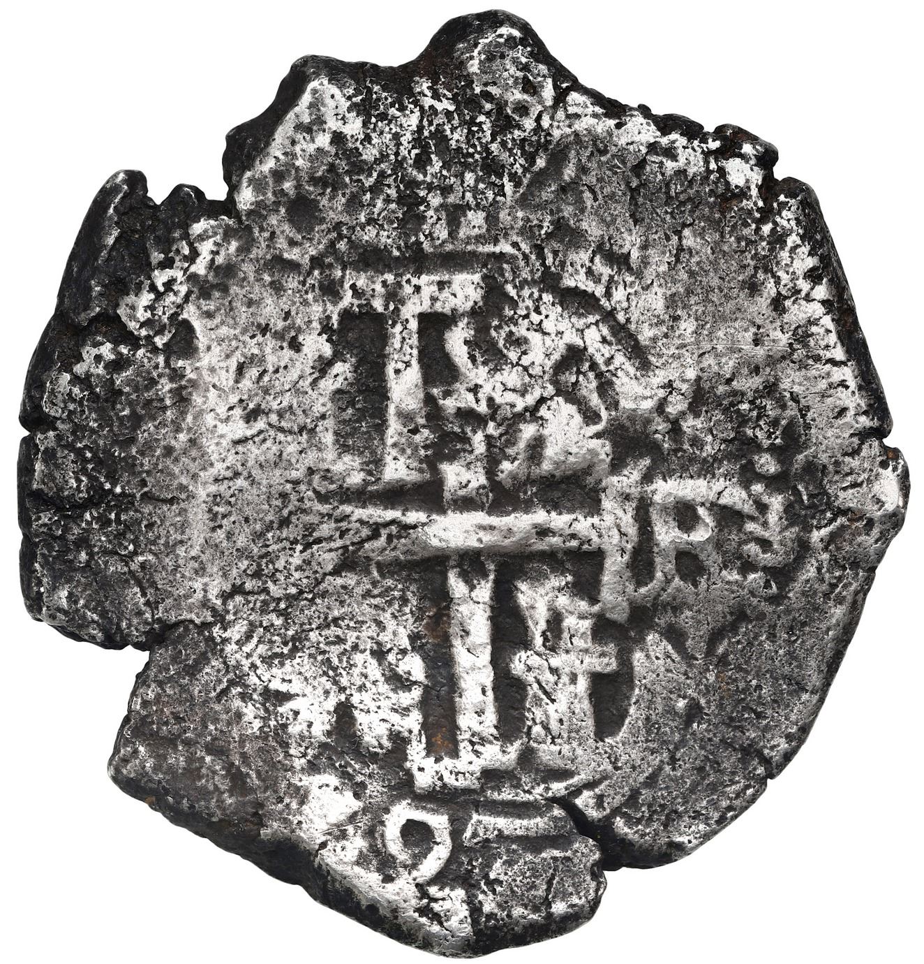 Potosi, Bolivia, cob 8 reales, 1697 F. S-P42; KM-26; Cal-742. 24.15 grams. Bold full pillars-and-waves, the nearly full cross also bold but double-struck, two dates, three assayers, light surface corrosion, well toned, parts of edge crude (as made). From: Spanish 1715 Fleet, east coast of Florida