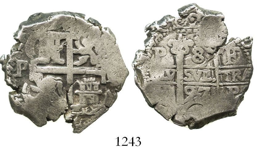 Potosi, Bolivia, cob 8 reales, 1697F. S-P42; KM-26; CT-385. 27.4 grams. Nearly full and well-centered pillars and cross, Fine+ with toning around details, crude edge all around (as made) with one deep split.