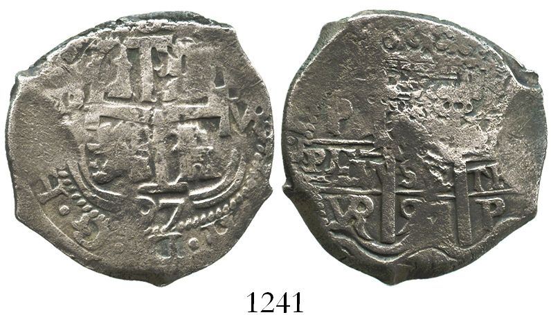Potosi, Bolivia, cob 8 reales, 1697VR. S-P40; KM-26; CT-383. 26.1 grams. Bold pillars, full but double-struck cross, 1-1/2 dates, 2 assayers and mintmarks, AVF with very light surface porosity (unspecified shipwreck).