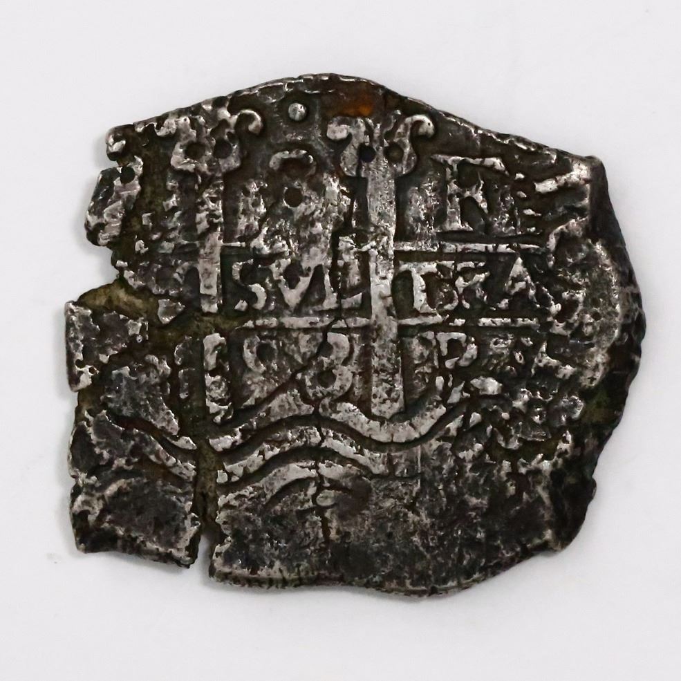 Potosi, Bolivia, cob 8 reales, 1698F. S-P42; KM-26; CT-387. 23.19 grams. Chunky Fine+ with deep toning, full pillars, bold assayer, surface crack and possible shipwreck oxidation. Pedigreed to the Mark Bir collection (our Auction #8, with original lot-tag #1487).