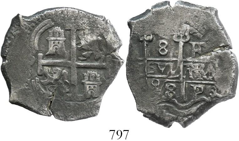 Potosi, Bolivia, cob 8 reales, 1698F. S-P42; KM-26; CT-387. 25.0 grams. Choice full cross, full pillars with bold date and denomination and assayer, richly toned and totally corrosion-free, from a possible pirate wreck off Mar Bravo, hidden by locals who avoided confiscation by melting the silver coins into spoons and the gold coins into teeth. From the Unidentified ca.-1700 wreck off Punta Santa Elena, Ecuador, pedigreed to the Marty Meylach collection.
