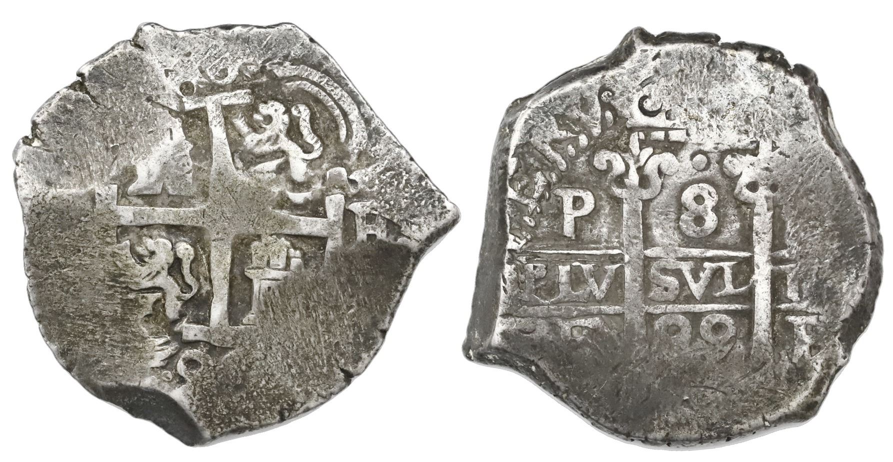 Potosi, Bolivia, cob 8 reales, 1699F. S-P42; KM-26; Cal-745. 27.40 grams. Full pillars and cross despite peripheral flatness, two partial dates and assayers and mintmarks, deeply toned Fine.