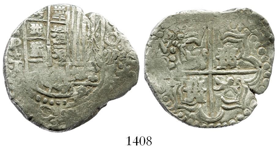 Potosi, Bolivia, cob 8 reales, 16ZIII (1623)T, quadrants of cross transposed, rare, from the 1629 "Panama hoard." S-P22a; KM-19. 25.9 grams. Choice full cross with bold ZII of date, full P+T, doubled shield, crude shape but nice detail for era, AXF with orange sediment in crevices.