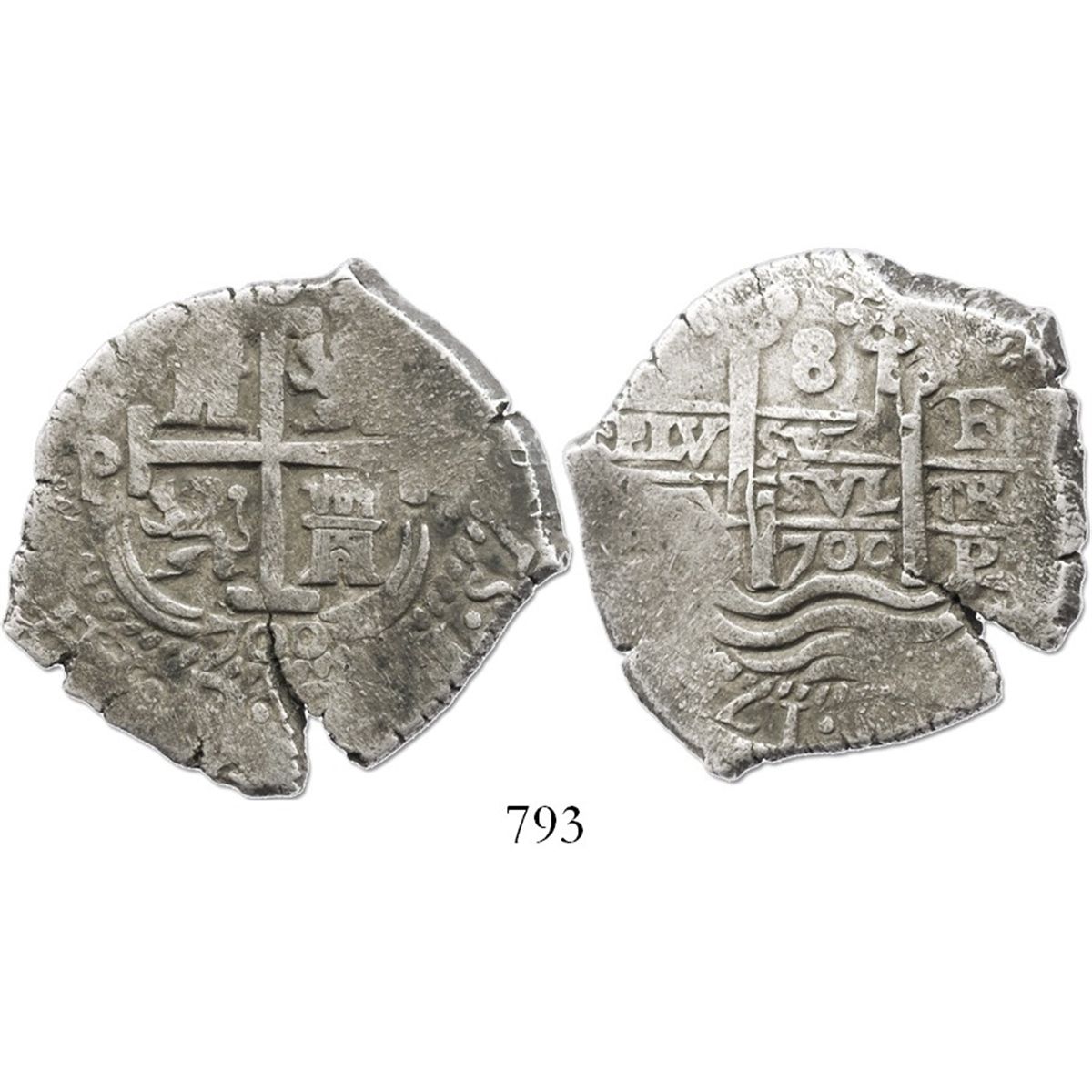 Potosi, Bolivia, cob 8 reales, 1700F. S-P42; KM-26; CT-389. 26.5 grams. Excellent specimen for this crude period, with full but off-center cross and full but slightly doubled pillars-and-waves, 2-1/2 bold dates, lightly toned VF+ with edge-split.
