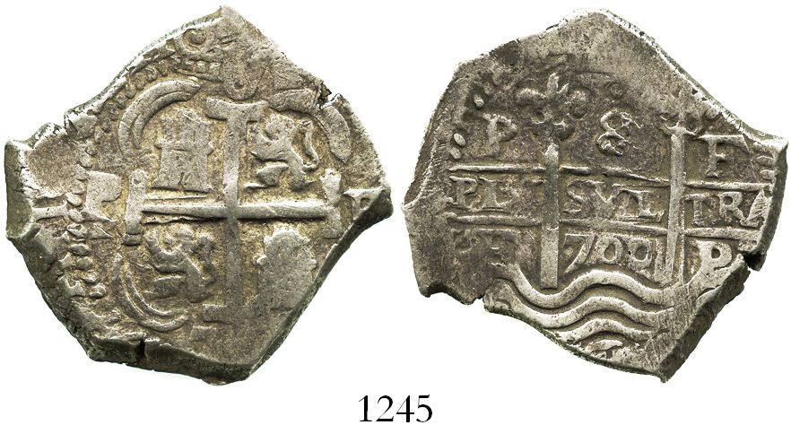 Potosi, Bolivia, cob 8 reales, 1700F. S-P42; KM-26; CT-389. 26.0 grams. Excellent full pillars-and-waves and cross-lions-castles on a somewhat rectangular flan, with clear date, 3 mintmarks and assayers, bold VF with contrasting sediment on fields.