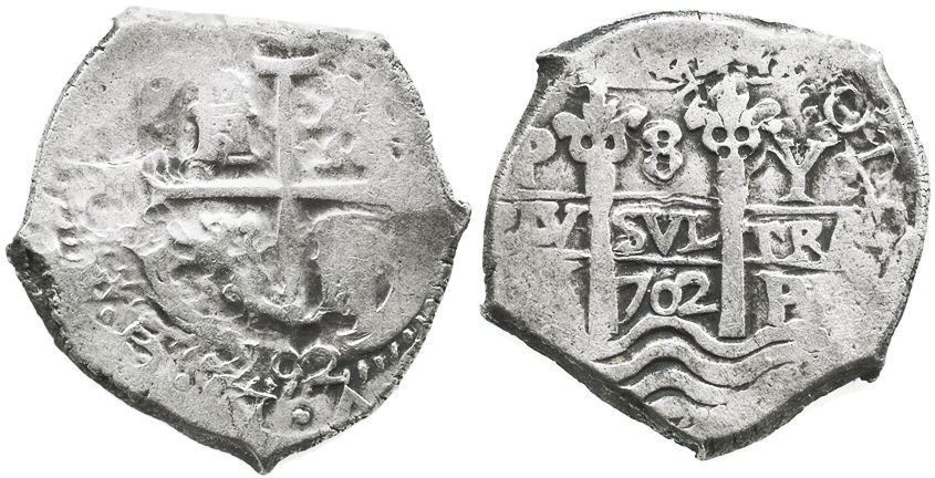 Potosi, Bolivia, cob 8 reales, 1702Y. S-P43a; KM-31; CT-862. 27.9 grams. Choice full pillars-and-waves with bold date and assayer, full but slightly off-center cross with second bold date below, just above king's ordinal V in legend, AVF with toning around details.
