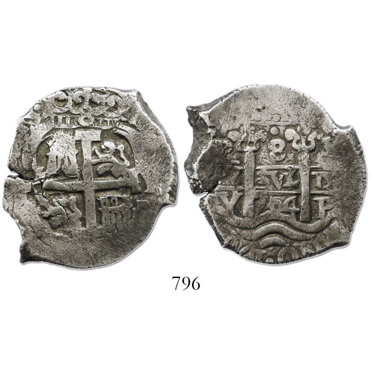 Potosi, Bolivia, cob 8 reales, 1704Y. S-P43a; KM-31; CT-864. 26.8 grams. Bold full pillars-and-waves and cross, both very well centered, with 2 pillars-side dates, parts of all 3 assayers, lightly toned AVF.