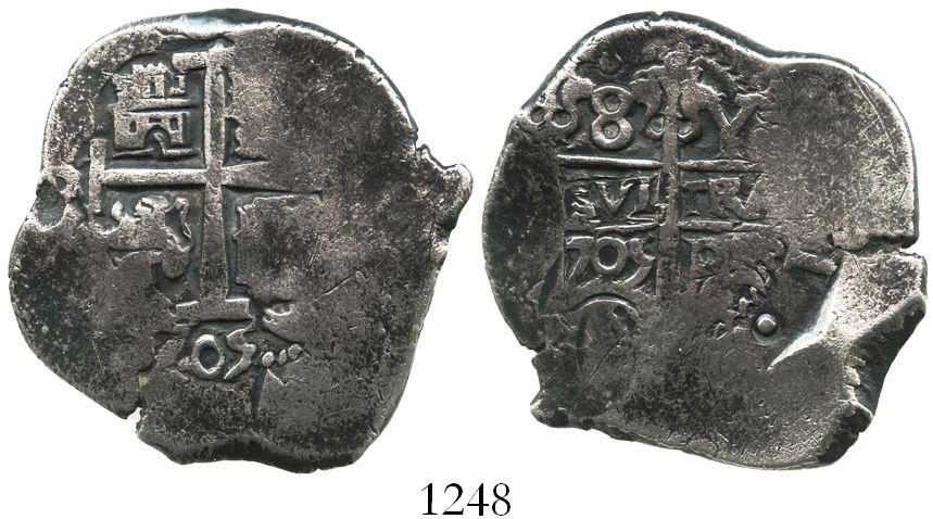 Potosi, Bolivia, cob 8 reales, 1705Y. S-P43a; KM-31; CT-865. 26.5 grams. Nearly full and well-detailed cross with bold date below, off-center pillars with second bold date and assayer Y, much flatness but otherwise Fine and toned.
