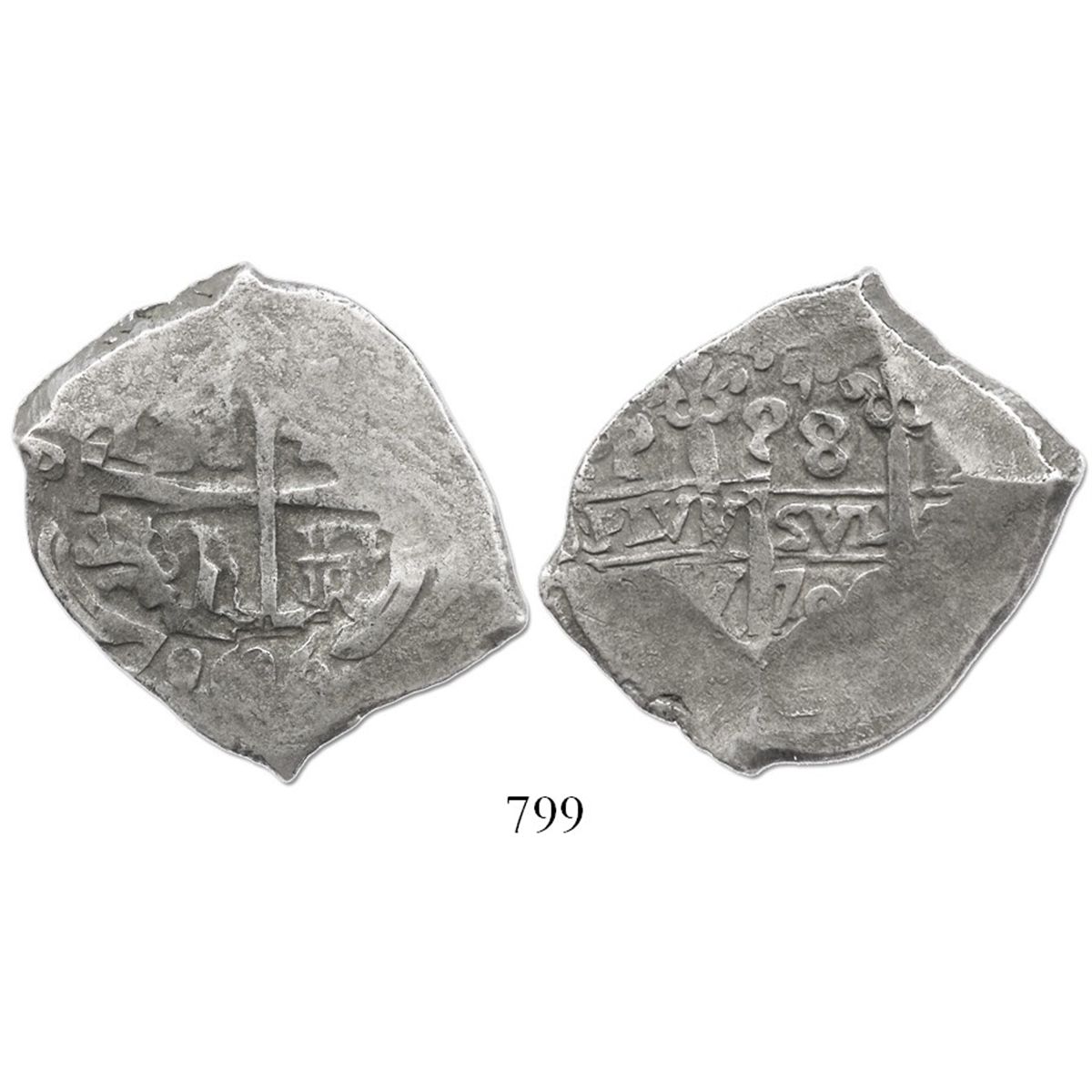 Potosi, Bolivia, cob 8 reales, 1706Y. S-P43a; KM-31; CT-866. 22.9 grams. Small flan (inexplicably underweight, as made), 2 dates, pillars and cross both doubled, lightly toned VF, just crude per the era.
