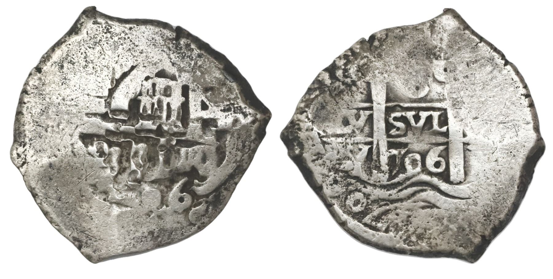 Potosi, Bolivia, cob 8 reales, 1706Y. S-P43a; KM-31; Cal-1541. 26.59 grams. Typically chunky with much peripheral flatness but with three dates, including bold 706 between pillars, full 1706 in legend and bold 06 date below very doubled cross, Fine+ with traces of porosity, toning around details.