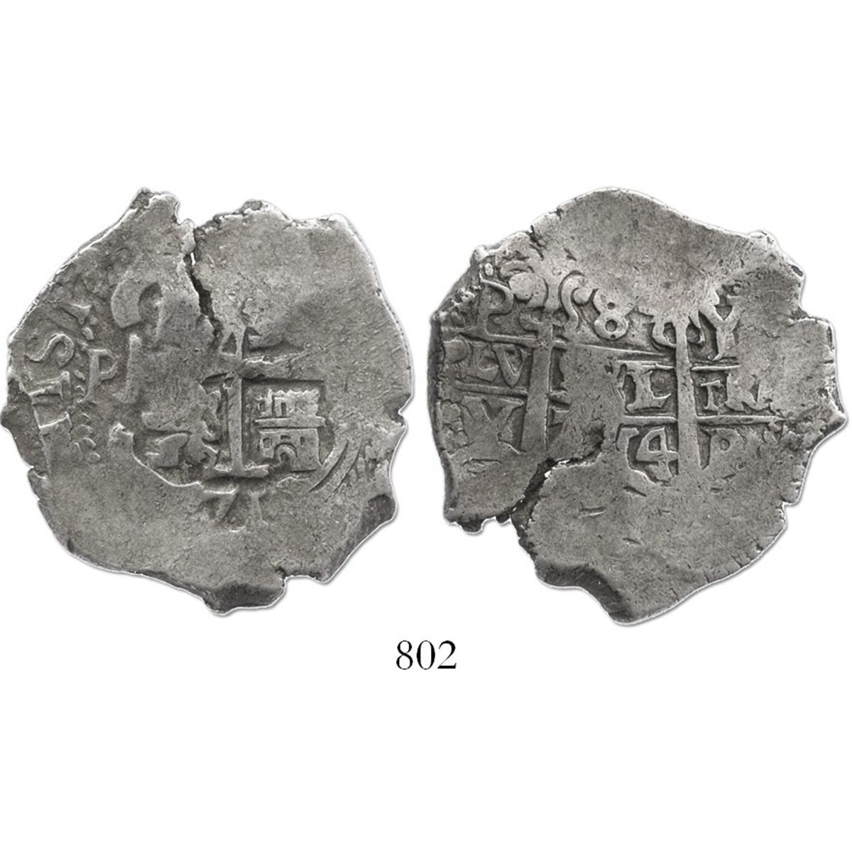 Potosi, Bolivia, cob 8 reales, 1714Y. S-P43a; KM-31; CT-874. 26.1 grams. Full pillars, 2 dates and assayers, 3 mintmarks, nicely toned but typically crude, with edge-split, AVF for actual wear.