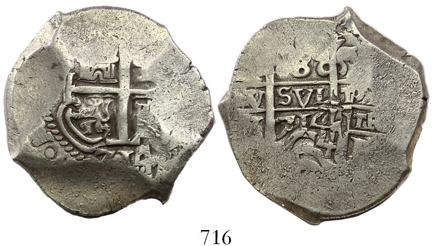 Potosi, Bolivia, cob 8 reales, 1714Y. S-P43a; KM-31 ;CT-874. 26.66 grams. Choice centers (doubled on pillars side) with two bold dates, but peripheries flat, VF for actual wear, nicely toned, scarce date.