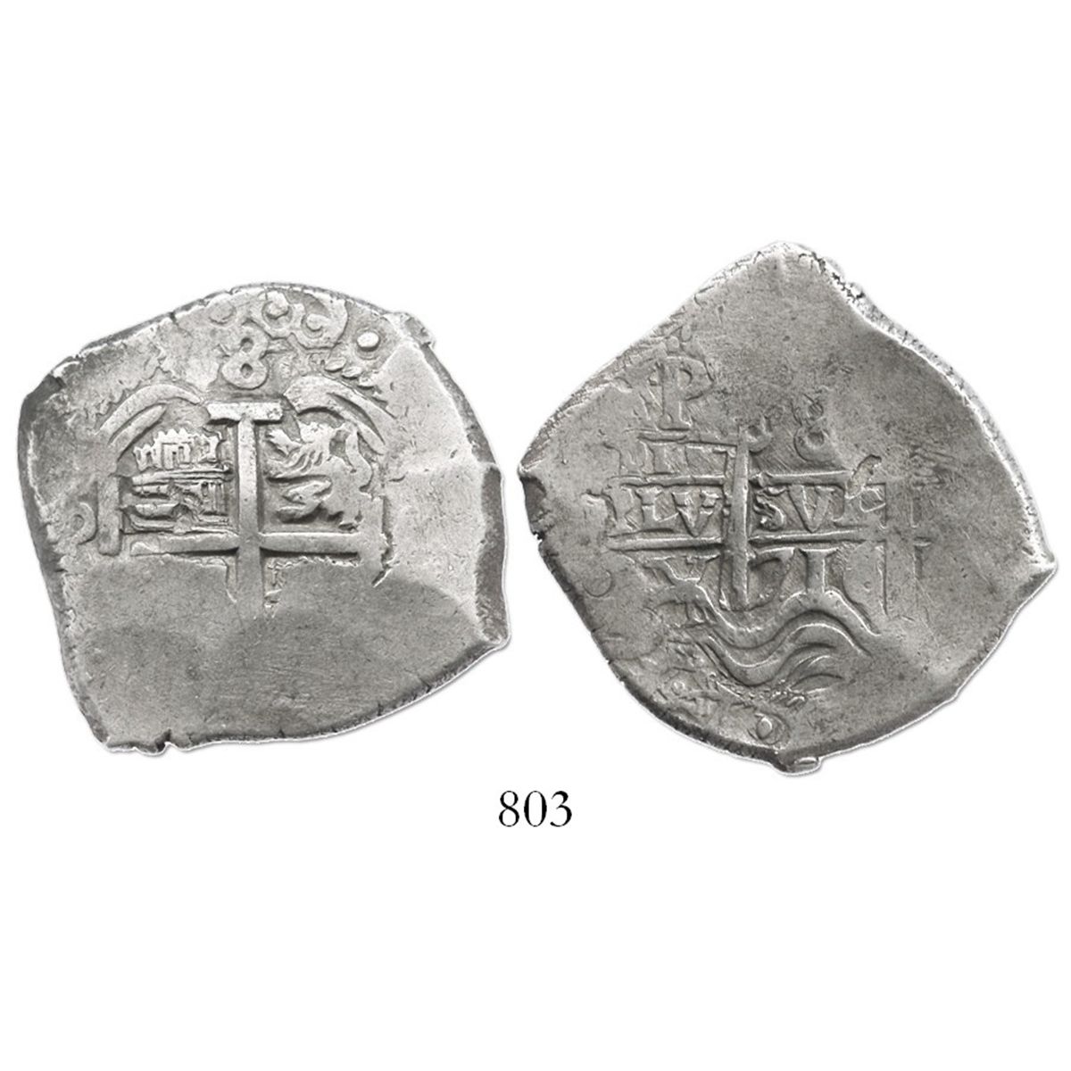 Potosi, Bolivia, cob 8 reales, 1716Y. S-P43a; KM-31; CT-876. 26.7 grams. Bold waves with clear date above, choice lion and castle in upper half of cross, VF with nice toning but much flatness as usual.