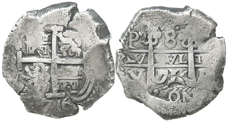 Potosi, Bolivia, cob 8 reales, 1716Y. S-P43a; KM-31; CT-876. 26.7 grams. Nice full cross, full pillars with doubling below, 2 clear dates, toned AVF with edge-splits.