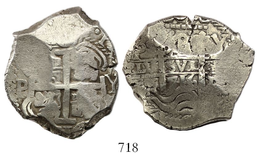 Potosi, Bolivia, cob 8 reales, 1716Y. S-P43a; KM-31 ;CT-876. 26.56 grams. Very crude, chunky and uneven flan but with parts of all three dates and mintmarks and assayers (rare thus), technically full pillars and cross, Fine+ with edge-split.