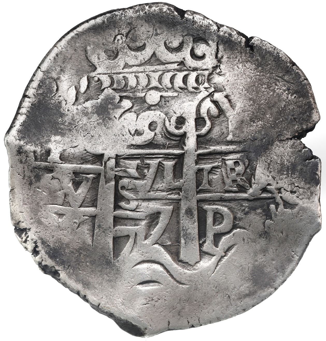 Potosi, Bolivia, cob 8 reales, 1717 Y. S-P43a; KM-31; Cal-1553. 26.77 grams. Round but chunky flan with choice full cross, nearly full but doubled pillars with nearly full crown above, two dates, AVF with toning in crevices, touch of porosity near parts of edge.