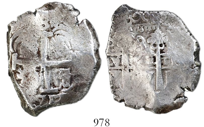 Potosi, Bolivia, cob 8 reales, 1717Y. S-P43a; KM-31; CT-877. 27.23 grams. One pillar full and bold, full but weak cross with clear date below, Fine with extensive flatness.