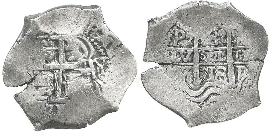 Potosi, Bolivia, cob 8 reales, 1718Y. S-P43a; KM-31; CT-878. 27.0 grams. Broad flan with full pillars-and-waves, full but doubled cross, 2 dates and mintmarks and assayers, nicely toned AVF with bid edge-split.