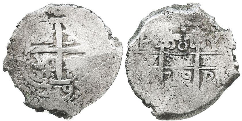 Potosi, Bolivia, cob 8 reales, 1719Y. S-P43a; KM-31; CT-879. 26.9 grams. Thick, roundish flan with full cross and pillars but peripheral flatness, bold assayer and 2 clear dates and mintmarks, Fine with toned fields.