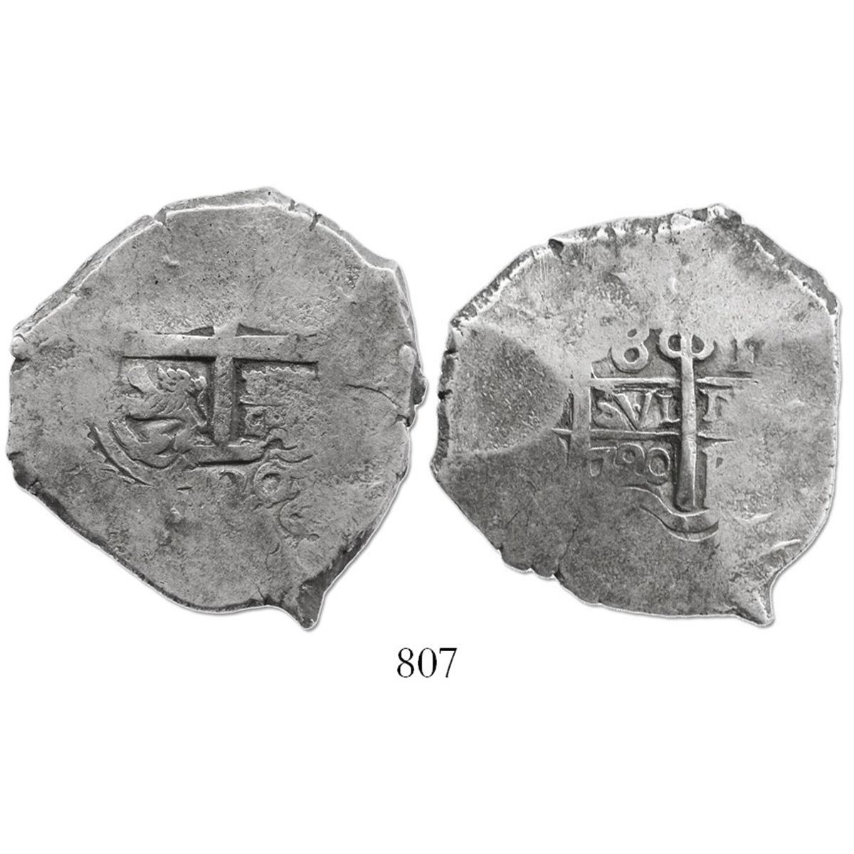 Potosi, Bolivia, cob 8 reales, 1720Y. S-P43a; KM-31; CT-880. 26.3 grams. Two clear dates, one full pillar, decent AVF in centers but rest of coin flat, nicely toned, scarce.