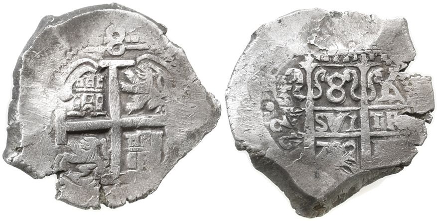 Potosi, Bolivia, cob 8 reales, 1722Y. S-P43a; KM-31; CT-882. 27.0 grams. Full pillars with 2 clear dates dues to doubling, good full cross, toned VF with typically crude edge.