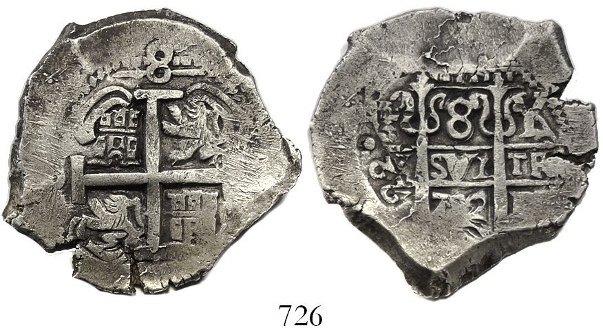 Potosi, Bolivia, cob 8 reales, 1722Y. S-P43a; KM-31 ;CT-882. 27.03 grams. Bold full pillars with two clear dates (rare thus), also choice full cross-lions-castles, much better than usual for this period, toned VF with parts of edge jagged (as made), scarce.