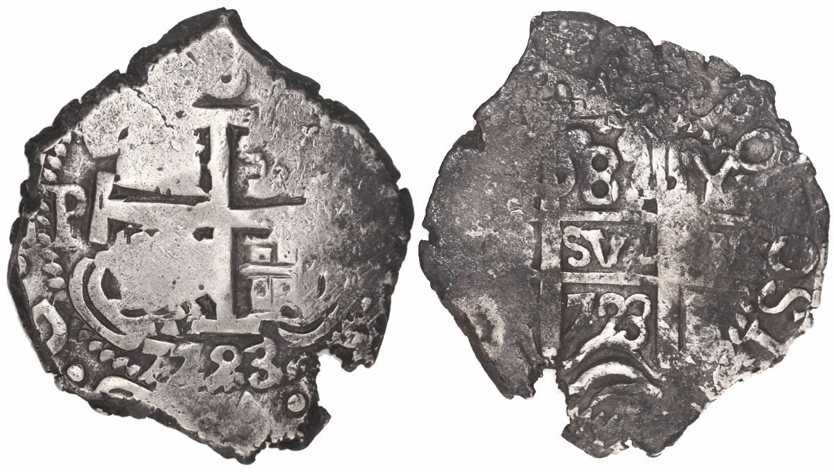 Potosi, Bolivia, cob 8 reales, 1723Y. 25.07 grams. Two full dates (very scarce, missing in Karon), nearly full cross and pillars, full POTOSI, AVF with dark toning on pillars side only, part of edge crude (as made). Pedigreed to our Auction #16, with original lot-tag #629.