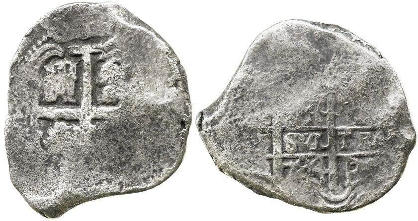 Potosi, Bolivia, cob 8 reales, 1724(Y). S-P43a; KM-31; CT-884. 23.7 grams. Bold full pillars and date, most of cross, otherwise flat and somewhat worn from corrosion but contrastingly toned. Recovered from: Princess Louisa, sunk in 1743 off the Cape Verde Islands, west of Africa