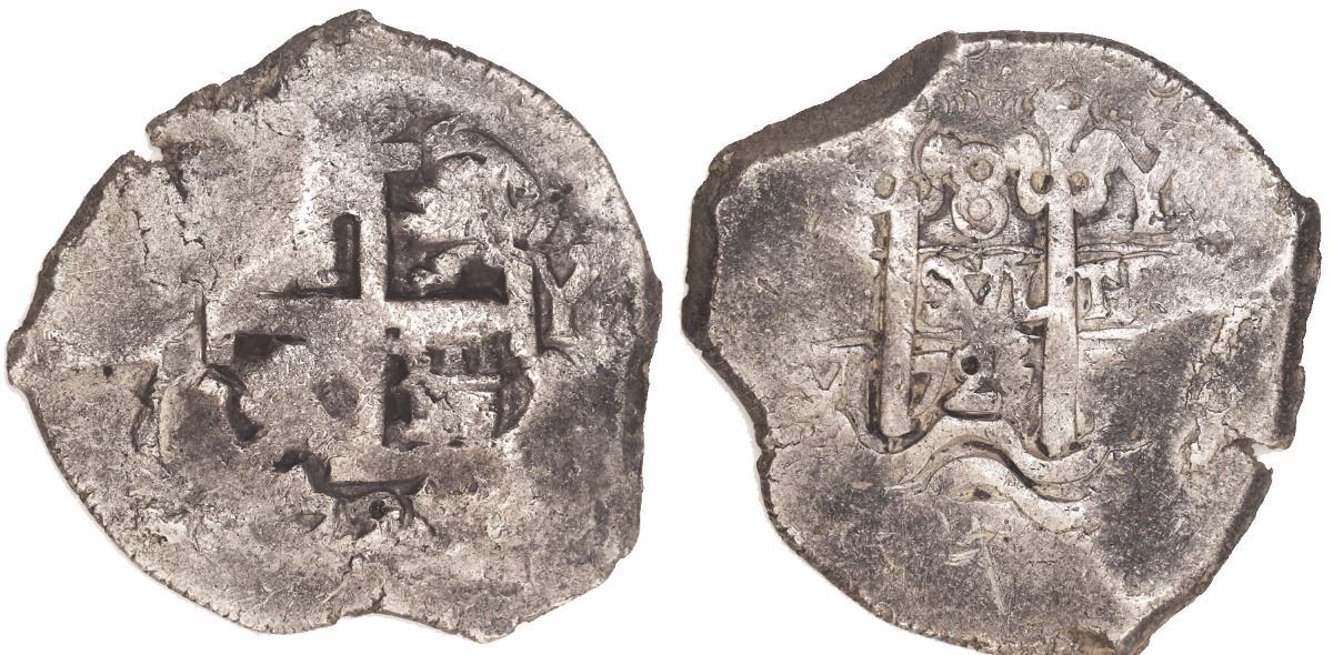 Potosi, Bolivia, cob 8 reales, 1725Y (Louis I). 27.67 grams. Very crude strike with totally flat peripheries and chunky flan, still with full pillars and cross, Fine with dark toning in crevices of cross only.