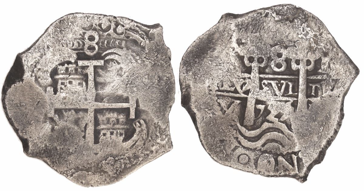 Potosi, Bolivia, cob 8 reales, 1725Y, (Louis I). 25.90 grams. Good pillars and cross despite usual flatness, contrasting toning, Fine or better. Pedigreed to our Auction #17, with original lot-tag #935.