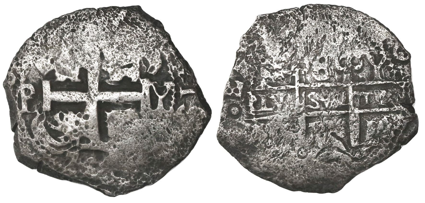 Potosi, Bolivia, cob 8 reales, 1726Y, Louis I, rare. S-P43b; KM-35; CT-25. 19.97 grams. Bold cross with clear assayer and mintmark and LVIS in legend, full but corroded pillars with second assayer and weak but certain date, toned all over. Recovered from: Princess Louisa, sunk in 1743 off the Cape Verde Islands, west of Africa