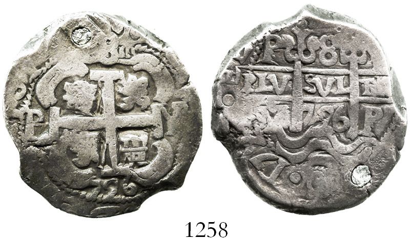 Potosi, Bolivia, cob 8 reales, 1726Y, Louis I. S-P43b; KM-35; CT-25. 27.0 grams. Good full pillars-and-waves and cross-lions-castles, 3 full dates and mintmarks (rare thus), but only Fine for wear (still nicely toned) and with crudely plugged hole at edge.