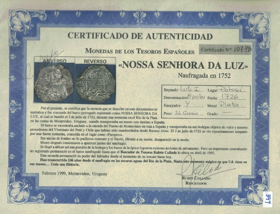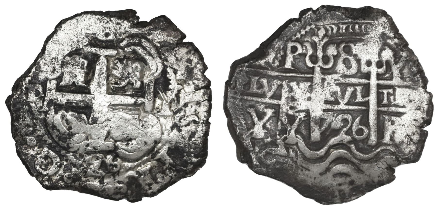 Potosi, Bolivia, cob 8 reales, 1726Y, Louis I. S-P43b; KM-35; Cal-49. 26.04 grams. Complete pillars-and-waves with bold date and both assayers and mintmarks (shifted from double-strike), weaker cross with bold second date and third mintmark and assayer plus clear LVIS PR in legend (rare thus), no corrosion but lots of black spots. With original photo-certificate #107-PB from the salvager (Collado).Recovered from: Luz, sunk in 1752 off Montevideo, Uruguay