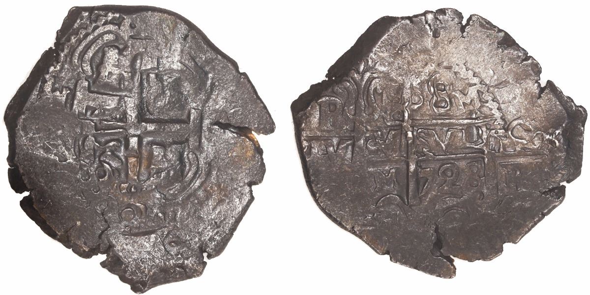 Potosi, Bolivia, cob 8 reales, 1728M. 26.86 grams. Full but doubled pillars and cross with two dates, multiple small edge-splits, very darkly toned XF (salvaged).