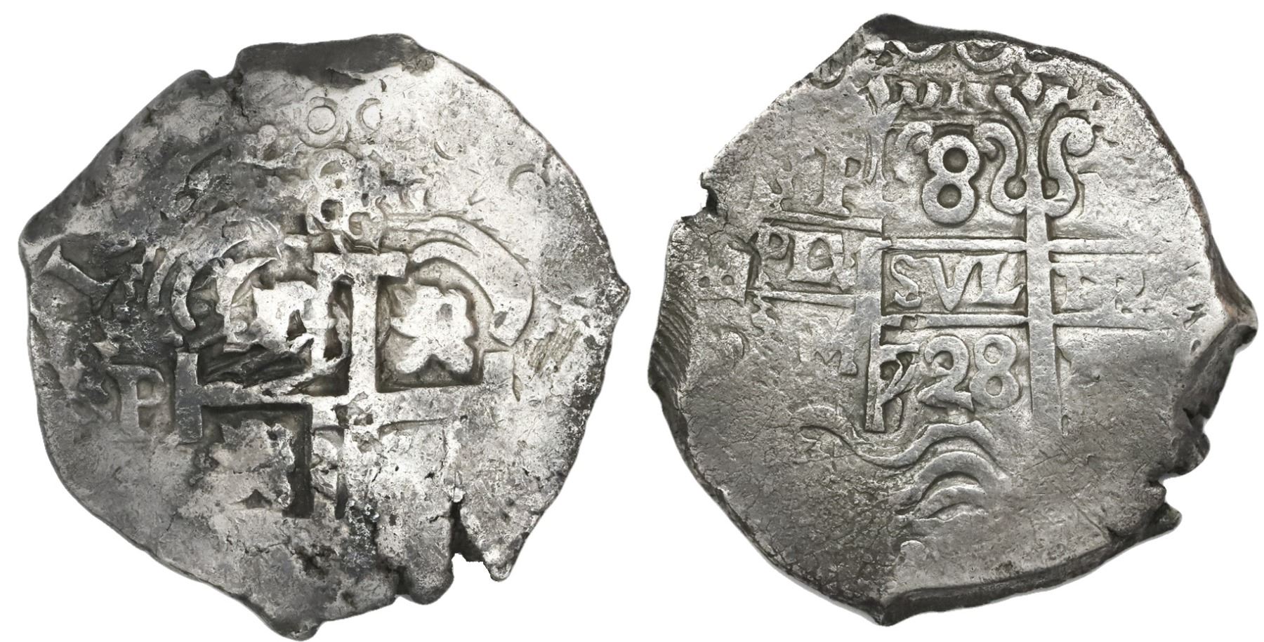 Potosi, Bolivia, cob 8 reales, 1728M. S-P44; KM-31; Cal-1561. 27.16 grams. Good full pillars-and-waves (slightly doubled), cruder cross (nearly full), peripherally flat Fine+ with minor black staining.