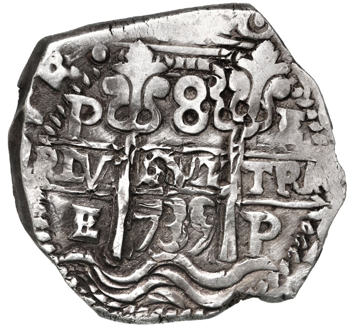 Potosi, Bolivia, cob 8 reales, 1735 E. S-P46; KM-31a; Cal-1570. 25.27 grams. Unusually even flan with sharply cut edge (as made), very bold full pillars-and-waves and cross-lions-castles, two dates and all three mintmarks and assayers (the latter unusually small, probably 4R punches), XF+ with light sediment on fields, clearly not a Royal but certainly a cut above the norm for this period.