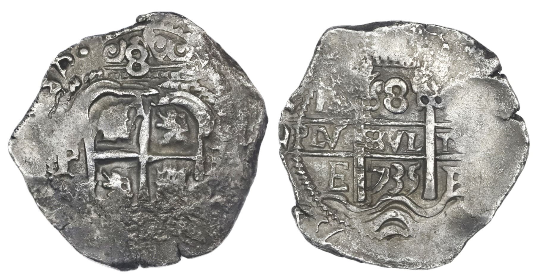 Potosi, Bolivia, cob 8 reales, 1735E. S-P46; KM-31a; Cal-1570. 26.25 grams. Deeply toned AXF with full pillars (two dates on that side) and cross, broader flan than usual for this period, with peripheral flatness and roughness.