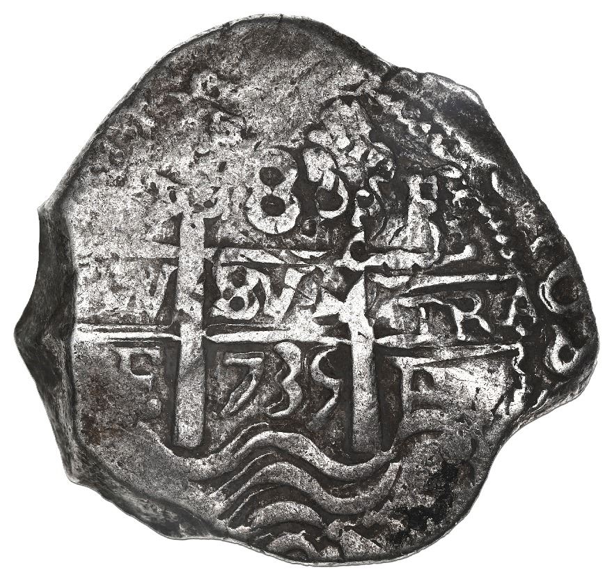 Potosi, Bolivia, cob 8 reales, 1735E. S-P46; KM-31a; Cal-1570. 26.89 grams. Chunky flan with nearly full pillars-and-waves with bold full date, second date below full cross, three assayers, lightly brown-toned VF with traces of doubling. Pedigreed to the Arturo Rosenheim collection.
